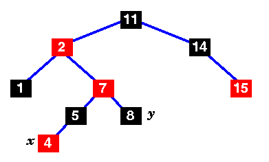 cvora "4" u stablo. Ovo vise nije crveno-crno stablo - postoje dva uzastopna crvena cvora na putu 11 - 2 - 7 - 5 - 4 Oznacimo novi cvor sa x, i njegovog ujaka sa y. y je crven, pa imamo slucaj 1 ... |